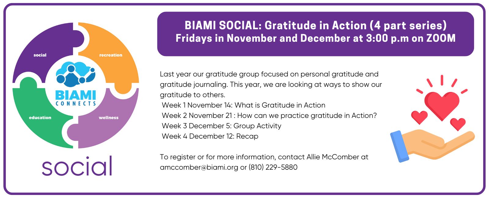 BIAMI Connects is an inclusive program designed to bring together individuals in the brain injury community through education, wellness, and social and recreational activities. From winning prizes on virtual bingo to attending a summer Detroit Tigers game… BIAMI Connects offers something for everyone! Typically meeting twice a month, BIAMI Connects gatherings take place on Fridays at 3PM on Zoom.